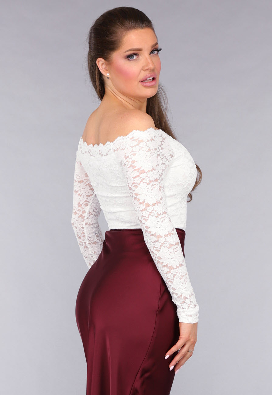 Langärmeliges schulterfreies Top aus Spitze in Weiß