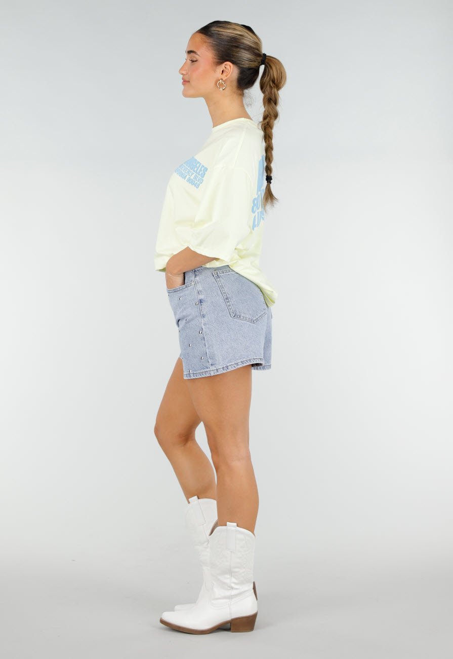 Hellgelbes, oversized T-Shirt mit lockerer Passform. Hergestellt aus glattem Baumwollstoff. Mit einem blauen Textdruck auf Brust und Rücken. Modell mit Rundhalsausschnitt und kurzen Ärmeln.