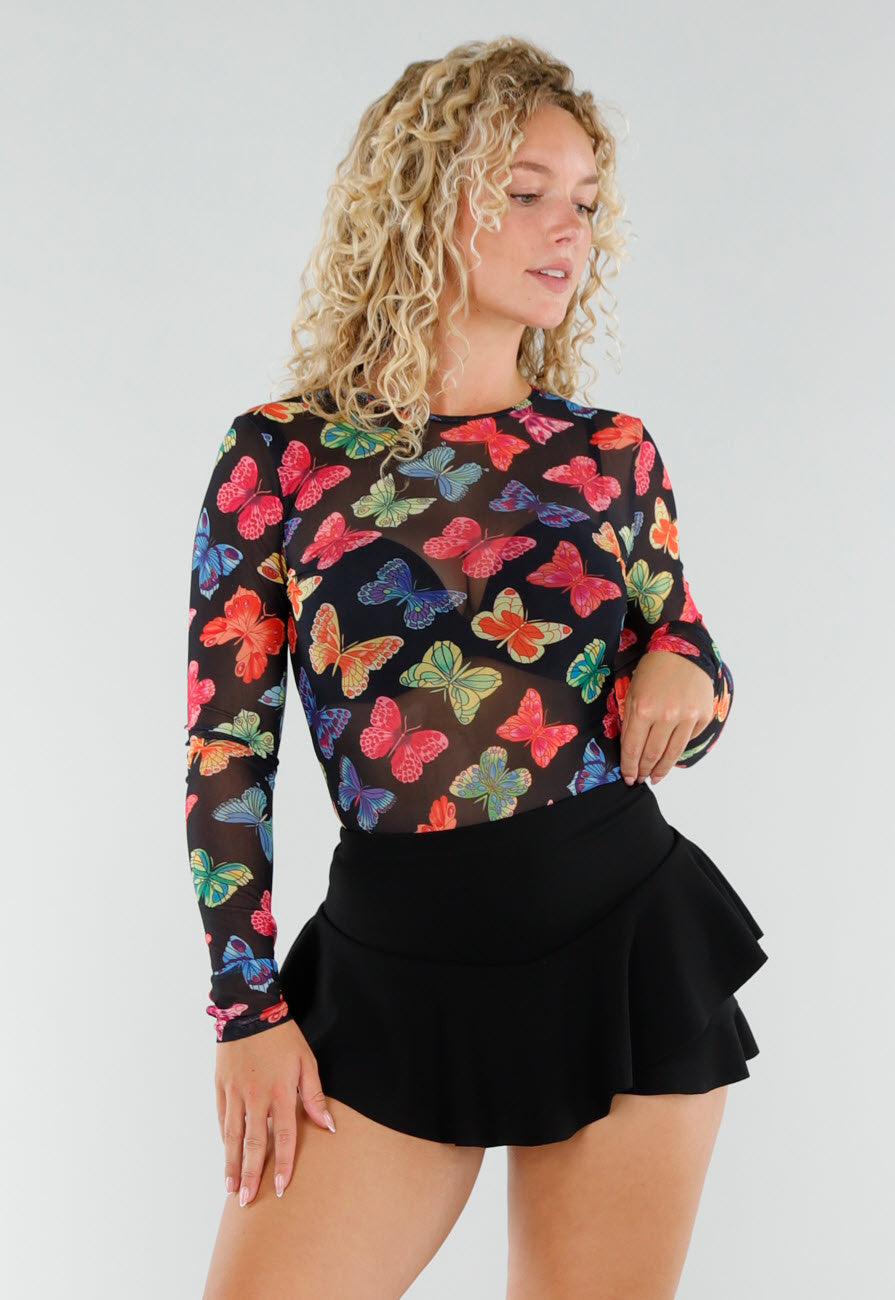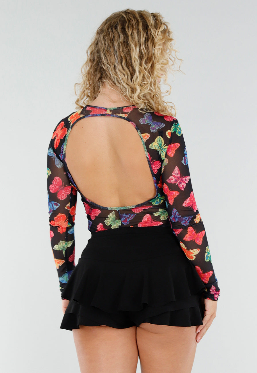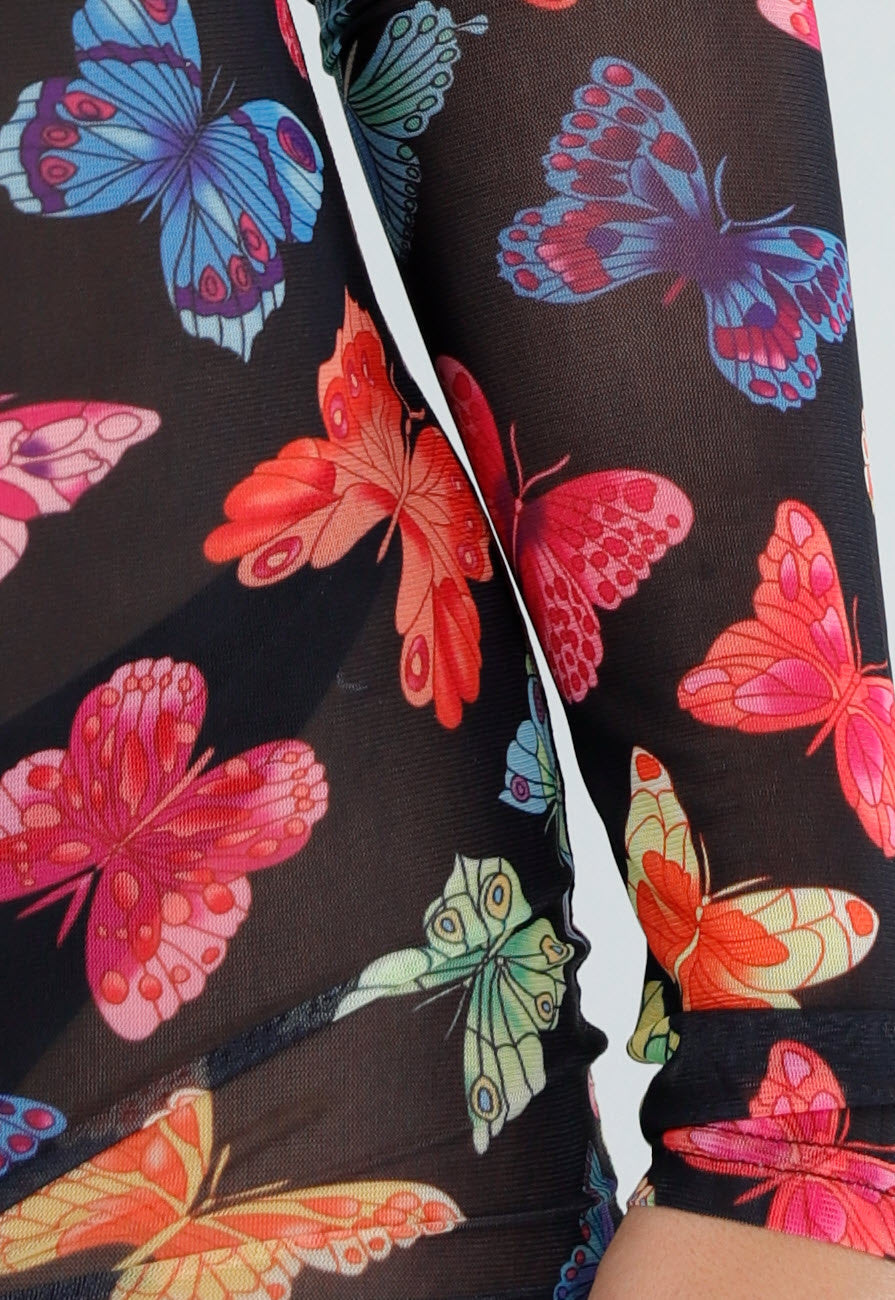 Dieser Playsuit ist aus transparentem, schwarzem Mesh mit einem bunten Schmetterlingsprint gefertigt. Er hat einen Rundhalsausschnitt, lange Ärmel und eine taillierte Passform. Der Playsuit hat einen offenen Rücken. Der Stoff ist dehnbar und liegt eng am Körper an, um eine figurbetonte Silhouette zu schaffen.