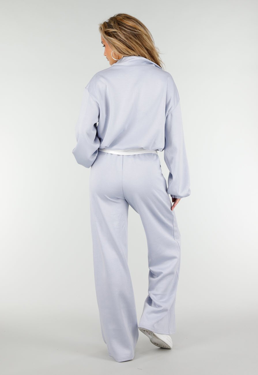 Lichtblauwe sweater met lange mouwen en een halve ritssluiting aan de voorkant. Voorzien van een opstaande kraag en elastische boorden bij de mouwen en onderzijde. Gemaakt van een zachte stof met stretch.