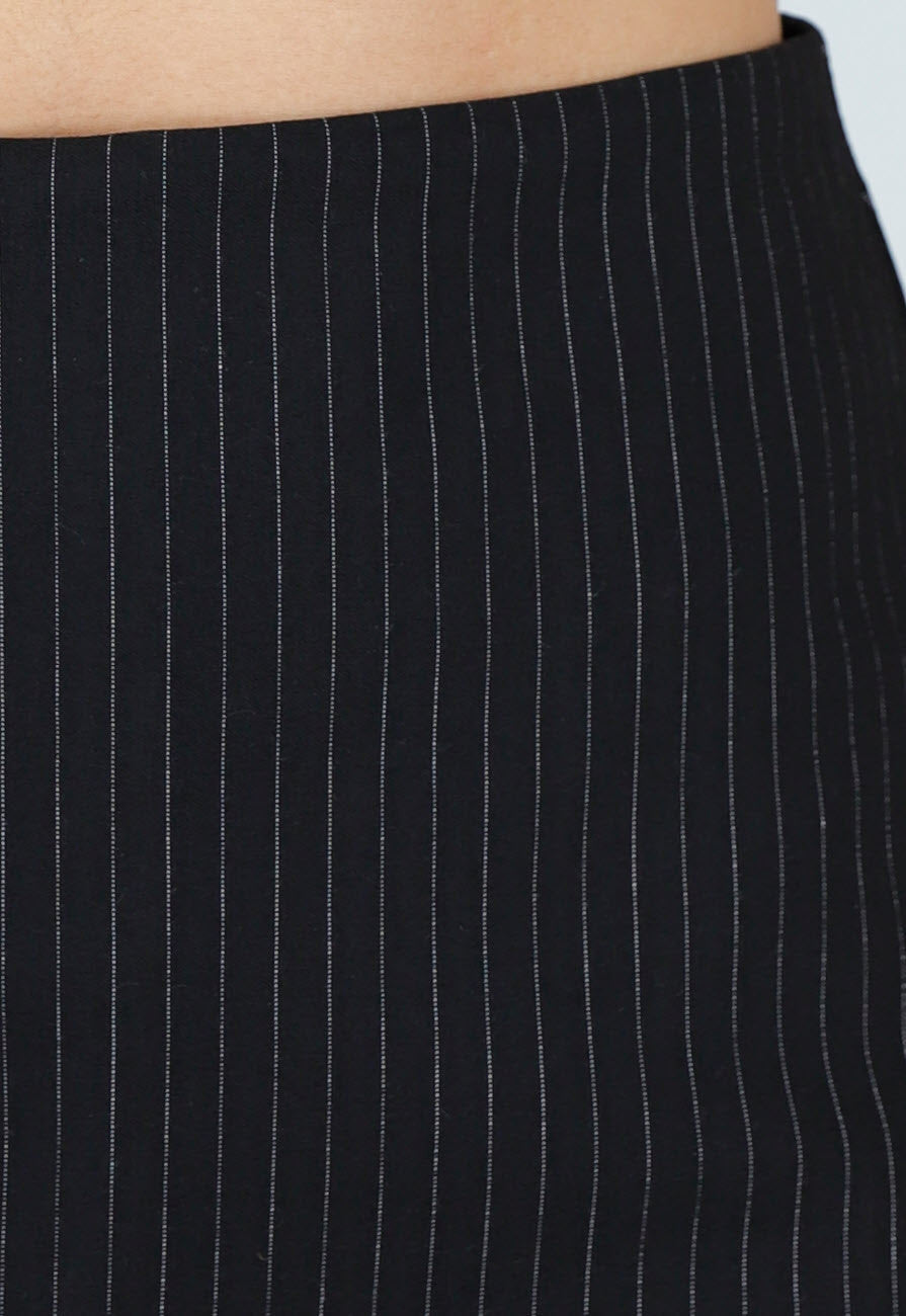 Schwarzer Mini-Skort mit dünnen Nadelstreifen. Verfügt über eine enganliegende Passform mit leichtem Stretch. Der Skort hat einen dezenten Schlitz an den Seiten und eine integrierte Hose unter dem Rock.