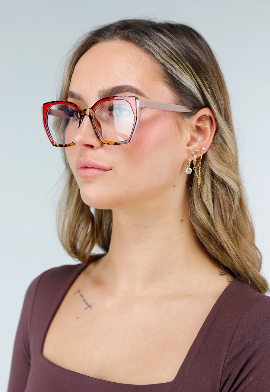 Diese Brille hat einen roten Rahmen mit Leopardenmuster auf der Vorderseite und beigefarbene Bügel. Das Modell hat eine rechteckige bis leicht eckige Form und ist mit klaren Gläsern ohne Tönung ausgestattet. Die Brille hat keine Sehstärke und ist nicht korrigierend, sodass sie ausschließlich als Modeaccessoire geeignet ist. Der Steg ist in den Rahmen integriert und die Bügel sind gerade mit leicht gebogenen Enden gestaltet.