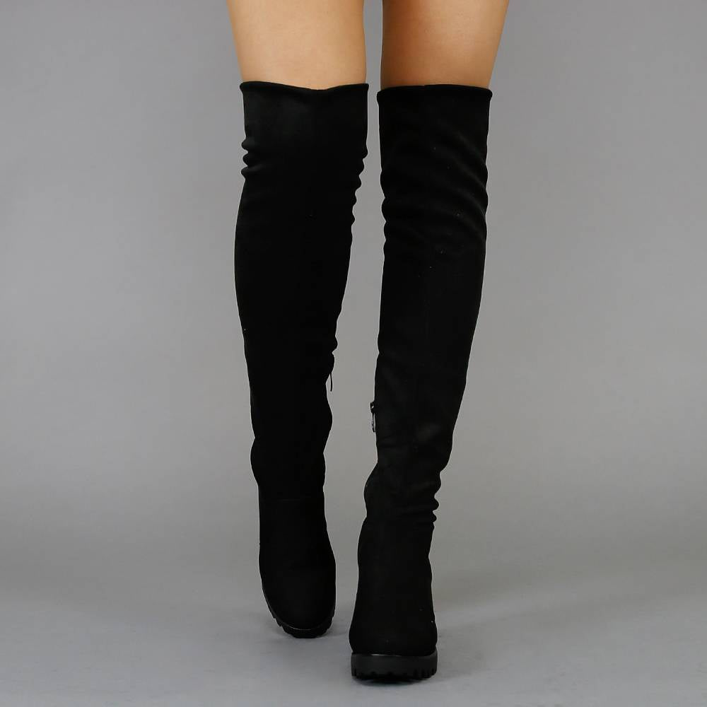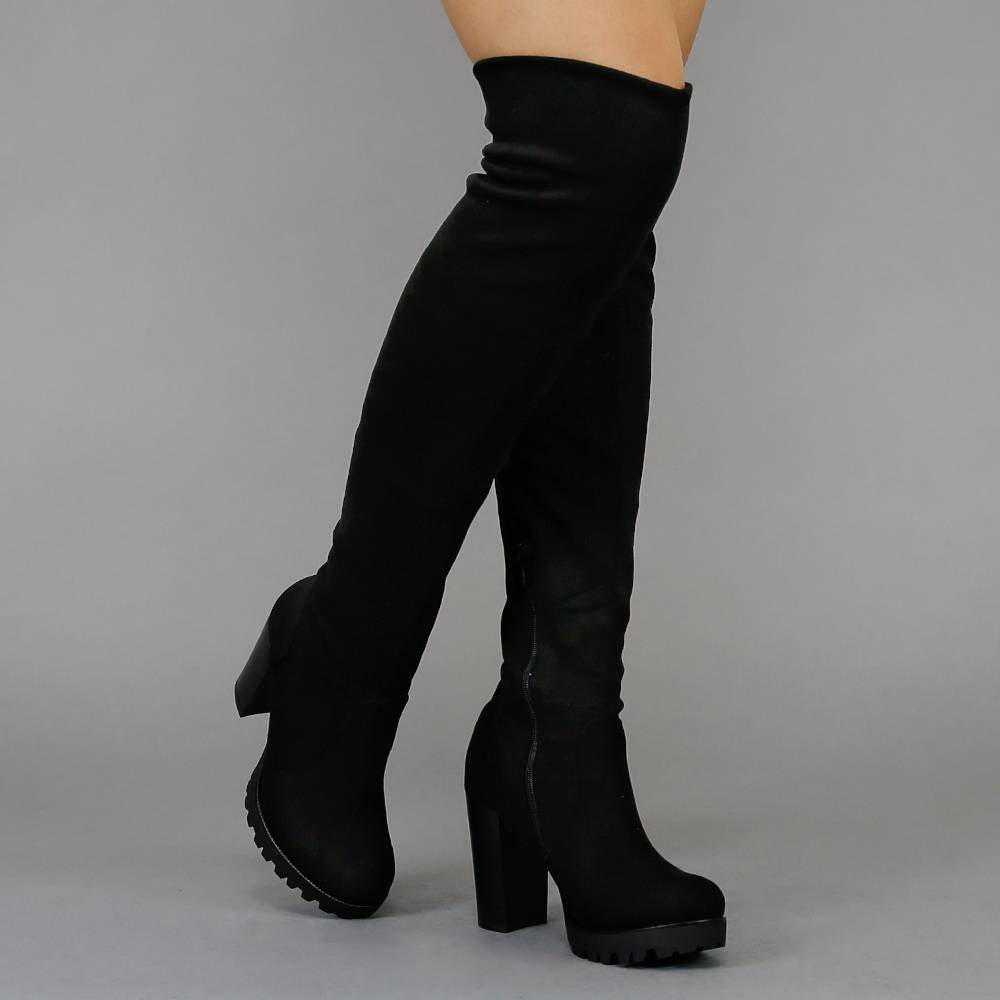 Stichworte: Stiefel, hohe Stiefel, schwarze Stiefel, Stiefel in Wildlederoptik, modische Stiefel, trendige Stiefel, Overknee-Stiefel, Stiefel mit klobiger Sohle, Stiefel mit Blockabsatz, Plateaustiefel