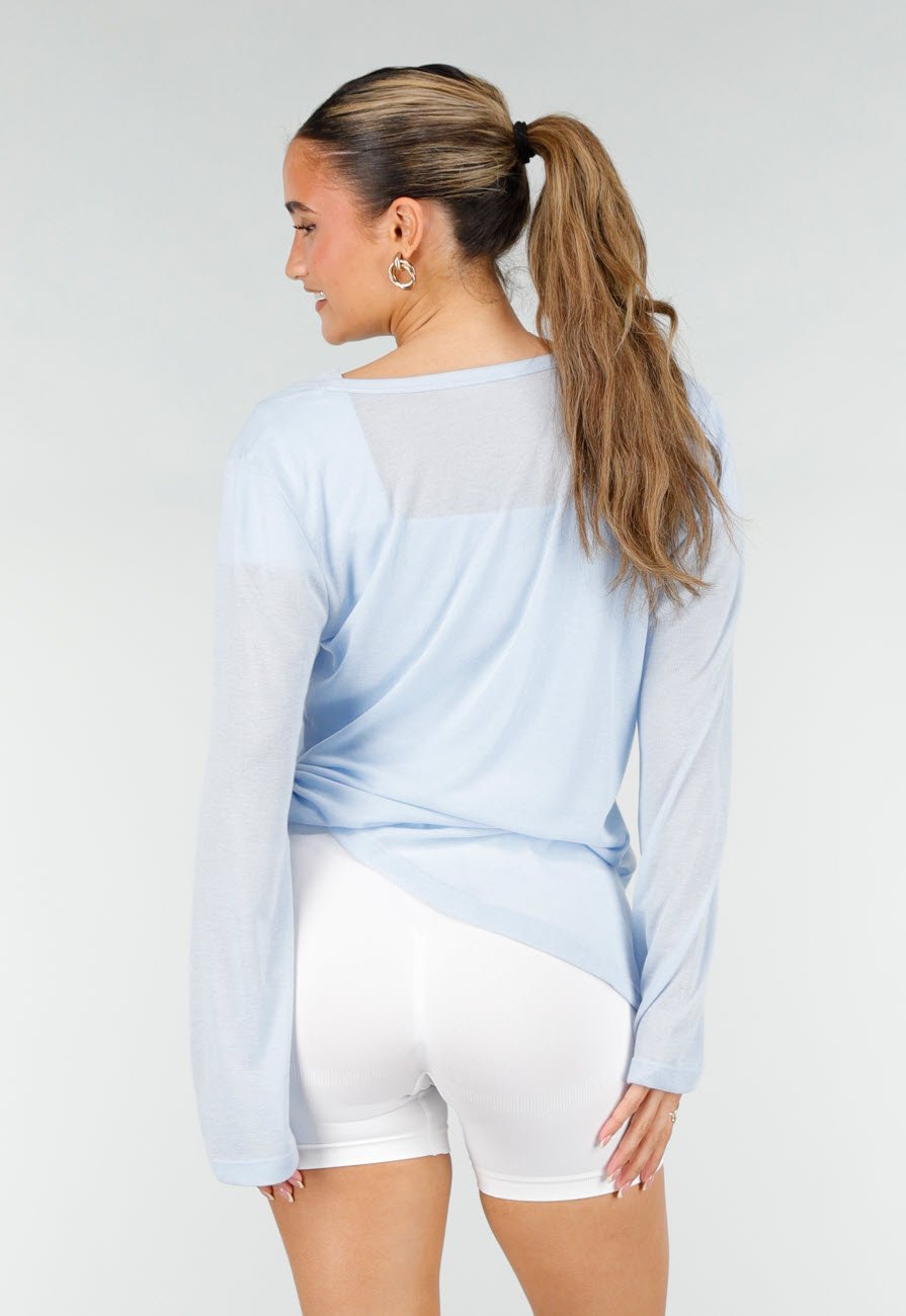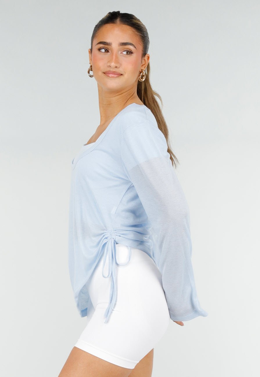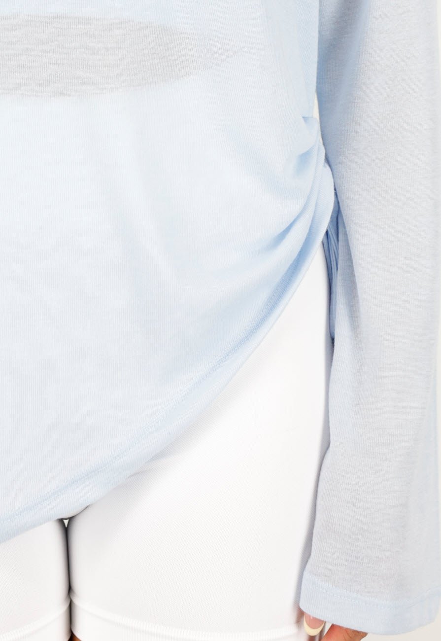 Hellblaues Langarmshirt aus einem weichen, leicht transparenten Stoff. Mit weitem Ausschnitt, langen Ärmeln und einem Kordelzug an der Seite. Das Oberteil hat eine lockere Passform und leichten Stretch.