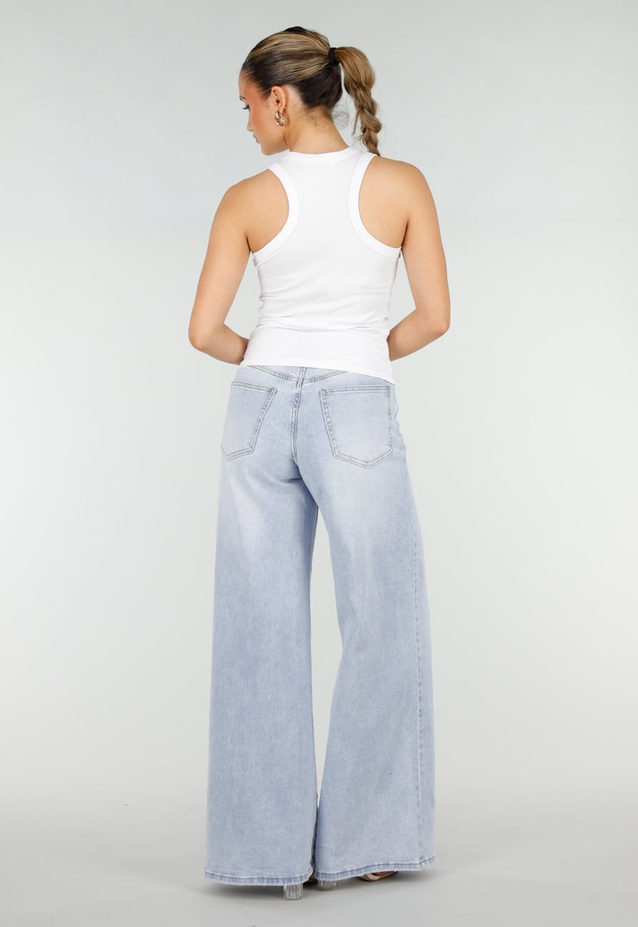 Weißes Tanktop mit eng anliegender Passform. Hergestellt aus Baumwollrippstoff mit Stretch. Mit rundem, hochgeschlossenem Ausschnitt und breiten Schulterträgern. Veredelt mit einem rosa Textprint auf der Brust.