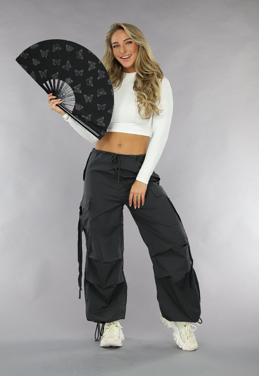 Dieser tolle Fächer ist perfekt für Indoor-Festivals! Das liegt daran, dass der Fächer grau aussieht, aber versuchen Sie, ein Blitzlichtfoto davon zu machen und Sie werden sehen, wie schön regenbogenholographisch reflektierend er ist! Der Fächer hat einen coolen Aufdruck, der bei Blitzlicht komplett aufleuchtet.