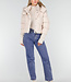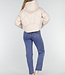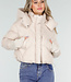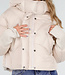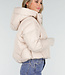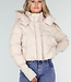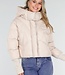 Diese hellbeige Pufferjacke hat eine kurze Passform und ist aus glattem, leicht glänzendem Material gefertigt. Die Jacke ist für zusätzliche Wärme dick wattiert und hat einen hohen Stehkragen, der gut am Hals anliegt. Die Kapuze bietet zusätzlichen Schutz vor Kälte und Wind. Die Jacke wird mit einem Reißverschluss und Druckknöpfen geschlossen und hat zwei Seitentaschen auf der Vorderseite. Die Ärmel sind mit breiten, elastischen Bündchen versehen.