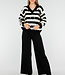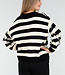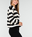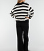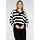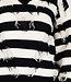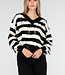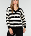 Dieser Pullover hat breite schwarze und beige Streifen und einen V-Ausschnitt. Der Strick ist grob und mit Fransenakzenten versehen, die über die Vorder- und Rückseite sowie die Ärmel verteilt sind. Der Pullover hat lange Ärmel und eine gerade Passform mit Rippbündchen an Hals, Ärmeln und Saum.