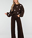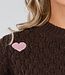 Dieser braune Pullover hat ein grob gestricktes Muster und einen Rundhalsausschnitt. Die langen Ballonärmel und die gerade Passform verleihen dem Pullover eine lockere Silhouette. Auf der Vorderseite befinden sich mehrere rosa Herzapplikationen, die einen Kontrast bilden. Die Ärmelbündchen und der Saum sind mit gerippten Strickbündchen versehen.