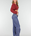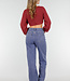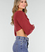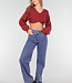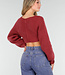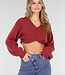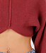 Dieser burgunderrote, kurz geschnittene Pullover ist aus einem grob gestrickten, weichen Stoff mit einem luftigen, offenen Strickmuster gefertigt. Der Pullover hat einen V-Ausschnitt und auffällige Ballonärmel. Das kurze Modell betont die Taille und lässt sich gut mit einer hohen Hose oder einem Rock kombinieren. Der Stoff fühlt sich angenehm an und ist dehnbar.