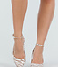 Diese Pumps sind mit einem auffälligen Zebramuster in Beige und Weiß versehen. Das Modell hat eine spitze Zehe und einen schmalen Stilettoabsatz. Am Knöchel befindet sich ein dünner Riemen mit einer kleinen Schnalle. Die Seite ist teilweise offen. Die Sohle ist glatt und der Pumps liegt eng am Fuß an.