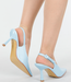 Diese Pumps sind in Hellblau gehalten und haben eine glänzende Lederoptik. Das Modell hat eine spitz zulaufende Spitze und einen schmalen, halbhohen Absatz. Der offene Absatz ist mit einem verstellbaren Slingback-Riemen versehen. Das Fußbett und die Sohle haben ein glattes Finish.