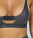 Dieses fantastische Oberteil hat eine versteckte Schönheit. Versuchen Sie, es mit Blitzlicht zu fotografieren, nur dann sehen Sie, wie schön regenbogenholographisch reflektierend es ist. Das Oberteil ist tailliert geschnitten und besteht aus einem Fallschirmstoff. Am unteren Ende des Tops befindet sich ein elastischer Bund, der für einen hohen Tragekomfort sorgt. Das Top enthält herausnehmbare Pads, so dass das Tragen eines BHs nicht unbedingt erforderlich ist. Außerdem hat das Oberteil verstellbare Träger, die man nicht lockern kann. Ein schönes zusätzliches Detail dieses Tops ist die Schnalle in der Mitte der Brüste. Das macht das Top noch verspielter und schafft einen schönen Ausschnitt in der Mitte des Tops. Die Rückseite des Tops besteht aus einem elastischen Band und einem Teil des reflektierenden Stoffes, was auch am Rücken einen schönen Effekt erzeugt. Dieses Top ist ideal für ein Indoor-Festival!