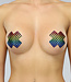 Diese Brustwarzenhüllen haben die Form eines Kreuzes. Die Kreuze sind komplett mit holografischen Herzen bedeckt. Die Rückseite ist mit einer Klebeschicht versehen, so dass sie um die Brustwarze geklebt werden kann. Der Bereich an der Brustwarze ist mit einem weichen Stoff versehen.