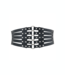 Dieser breite Taillengürtel ist ideal, wenn Sie Ihre Taille zur Geltung bringen wollen. Die Vorderseite besteht aus mehreren Riemen in Lederoptik mit Krokodilmuster und einem Paar silberfarbener Nieten. In der Mitte laufen sie zusammen und sind an silberfarbenen Ringen befestigt. Das Rückenteil ist mit einem Gummizug versehen und hat einen Druckknopfverschluss, der aus zwei Druckknöpfen besteht. Diese Druckknöpfe sind auf einer Krokodiloberfläche in Lederoptik angebracht.