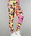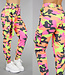 Diese Cargohose mit hoher Taille kommt in einem auffälligen Camouflage-Print mit neonpinken, orangen, limettengrünen und schwarzen Farbtönen. Das Modell hat elastische Bänder an der Unterseite. Die Hose ist aus einem leichten Stretch-Stoff gefertigt. Auf der Vorderseite hat die Hose einen Reißverschluss mit Knopf. Es gibt zwei Seitentaschen auf der Vorderseite und zwei große Taschen mit Klappe an der Außenseite der Beine. Die Hose ist mit Gürtelschlaufen und einem passenden Gürtel ausgestattet.