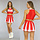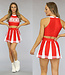 Das Oberteil ist ärmellos und hat einen Rundhalsausschnitt. Der Rock fällt schön weit und ist in Falten gelegt. Auf der Brust steht in roten Buchstaben CHEERS. Die Rückseite des Oberteils ist einfarbig rot.