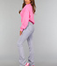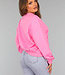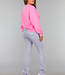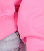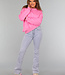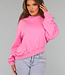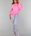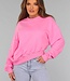 Dieser Pullover ist aus einem feinen, glatten und weichen Stoff gefertigt. Er hat lange Ärmel und einen Rundhalsausschnitt mit Rippenbündchen. Auch an der Unterseite und am unteren Ende der Ärmel. Was den Pullover einzigartig macht, ist der schräge Abschluss unten.
