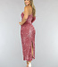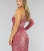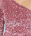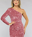 Dieses hübsche Kleid hat ein One-Shoulder-Design mit einem langen Ärmel. Das Kleid ist lang geschnitten und ist komplett mit Pailletten besetzt. Das Kleid ist elastisch und aus einem ziemlich dicken Stoff gefertigt und hat eine zusätzliche Schicht auf der Innenseite, die verhindert, dass die Pailletten jucken.