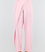 Diese Hose ist in einem Rosaton gehalten und hat eine Barrel-Passform. Das Modell hat eine hohe Taille mit einem Wickeldetail auf der Vorderseite, das mit einem Knopf geschlossen wird. Auf der Vorderseite sind dezente Falten eingearbeitet, die für zusätzliche Weite um die Hüften sorgen. Die Hose läuft leicht ausgestellt aus und verjüngt sich zum Knöchel hin. Der Bund ist elastisch. Der Stoff hat eine glatte Struktur und fällt geschmeidig am Körper entlang.