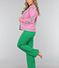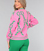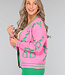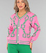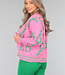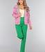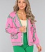 Diese Strickjacke hat lange Ärmel und einen übergroßen Schnitt. Sie hat einen V-Ausschnitt und auf der Vorderseite einen Knopfverschluss, der aus vier großen Knöpfen besteht. Außerdem ist diese Strickjacke mit einem Muster versehen.