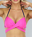 Dieses rosa und blaue Bikini-Oberteil hat einen Push-up-Effekt. Dieses Bikinioberteil hat ein Wickeloberteil, das sich selbst bindet und Bikini-Pads enthält. Der Bikini enthält auch einen Bügel, der den Brüsten guten Halt gibt. Kombinierbar mit dem passenden Bikini-Unterteil.