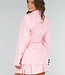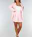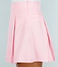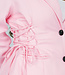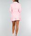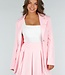 Dieses zweiteilige rosa Set besteht aus einem einreihigen Blazer und einem passenden Skaterrock. Der Blazer hat Schulterpolster und wird vorne mit zwei schwarzen Knöpfen geschlossen, die sich auch an den Ärmeln befinden. An beiden Seiten befindet sich eine korsettartige Schnürung, mit der die Taille verstellt werden kann. Der Rock hat eine hohe Taille, ist in Falten gelegt und hat eine ausgestellte Passform. Ein Blindreißverschluss auf der linken Seite sorgt für einen sauberen Abschluss. Der Stoff ist leicht dehnbar, was für zusätzlichen Tragekomfort sorgt.