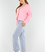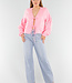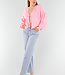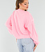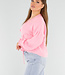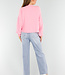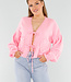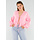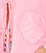 Diese Bluse ist einfarbig rosa und hat eine lockere, gerade Passform. Der Stoff ist leicht zerknittert. Auf der Vorderseite befinden sich zwei dekorative herzförmige Taschen mit Häkelbesatz und kleinen Stickereien. Die Bluse wird mit zwei schmalen Bändern geschlossen, die gebunden werden können, und hat einen tiefen V-Ausschnitt. Die Ärmel sind lang und weit mit gerafften, elastischen Bündchen, die mit gehäkelter Spitze abgeschlossen sind.