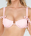 Dieses rosafarbene Balkonett-Bikinioberteil hat ein zartes Karomuster und verfügt über ein geformtes Bügel-Cup. Die Schulterträger sind breit und haben auffällige Schleifen auf der Vorderseite. Das Oberteil wird mit einem Druckknopfverschluss auf der Rückseite geschlossen. Der Stoff ist an den Cups leicht gerippt.