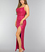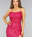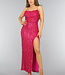 Dieses Kleid ist mit Pailletten besetzt und fällt bis zu den Knöcheln. Es hat einen geraden Ausschnitt und dünne, elastische Schulterträger. Das Kleid hat eine gute Passform und einen hohen Schlitz auf der Vorderseite. Es hat einen verdeckten Reißverschluss am Rücken, so dass es leicht an- und ausgezogen werden kann.