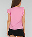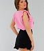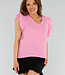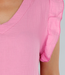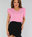 Dieses rosafarbene Oberteil ist aus einem luftigen Stoff mit Stretchanteil und einer Textur in Leinenoptik gefertigt. Es hat einen V-Ausschnitt und kurze Ärmel, die mit verspielten Rüschen abschließen. Der Stoff hat eine leicht gekräuselte, hydrophile Textur. Die Passform ist gerade und locker, das Oberteil fällt bis knapp über die Hüfte. Der Rücken ist einfarbig.
