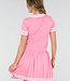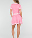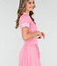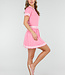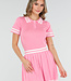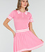 Dieses Set besteht aus einem eng anliegenden Oberteil und einem passenden Plisseerock in einfarbigem Rosa. Das Oberteil hat kurze Ärmel, einen festen Polokragen und Knopfverschlüsse auf der Vorderseite. Sowohl der Kragen als auch die Ärmelenden sind mit dezenten horizontalen Streifen verziert. Der Rock hat einen elastischen Bund und eine Plissee-Struktur mit Streifenakzenten entlang des Saums. Der Stoff hat eine feine, gleichmäßige Struktur und ist dehnbar.