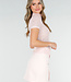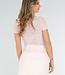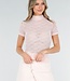 Dieses Oberteil ist aus einem hellrosa, elastischen Häkelstoff mit transparenter Struktur gefertigt. Das Modell hat kurze Ärmel und einen eng anliegenden Rollkragen. Der Stoff ist durchscheinend und dank seiner Stretchqualität sehr bewegungsfreundlich.