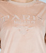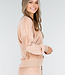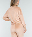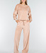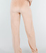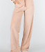 Dieses 2-teilige Set ist aus einem zartrosa Veloursstoff mit einem sanften Glanz gefertigt. Das Oberteil hat einen Rundhalsausschnitt, lange Ärmel und gerippte Bündchen. Die Hose hat eine locker fallende Silhouette mit geraden, weiten Beinen und einem elastischen Bund mit Kordelzug. Der Stoff fühlt sich weich an und ist dehnbar.