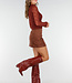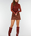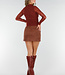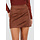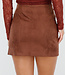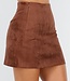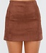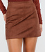 Dieser Rock ist in einem warmen Rostbraun gehalten und hat ein weiches Finish in Wildlederoptik. Er fällt kurz an den Oberschenkeln und hat ein schlichtes, sauberes Design ohne sichtbare Details auf der Vorderseite. Der Stoff hat einen samtigen Griff. An der Seite befindet sich ein blinder Reißverschluss.