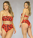 Dieses Bikini-Unterteil hat eine hohe Taille im Maxi-Stil und ist rot mit einem Leopardenmuster. Es fällt ein wenig zwischen den Pobacken. Um das Oberteil herum befinden sich vier Schlaufen, durch die ein breites Band mit festem Schnallenverschluss geführt wird.