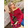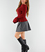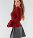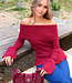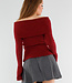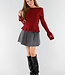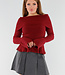 Dieser rote Pullover ist in einem feinen Rippenmuster gestrickt und hat einen schulterfreien Ausschnitt, der gerade über die Schultern verläuft. Das Design ist leicht tailliert und geht unten in eine dezente Schößchenform über. Die langen Ärmel haben einen breiten, ausgestellten Saum, der über das Handgelenk fällt. Der Stoff ist dehnbar und sitzt bequem. Der Halsausschnitt hat einen breiten, umgeschlagenen Saum.