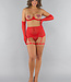 Dieses Set hat eine schöne rote Farbe. Der BH hat Bügel und ist mit einem Strassherz versehen, das mit Ketten befestigt ist. Der BH kann am Rücken mit einem Hakenverschluss geschlossen werden, der aus zwei Haken besteht, die in drei Positionen eingestellt werden können. Zum Set gehört ein Mesh-Strapsgürtel mit festen, verstellbaren Strapsen. Darunter tragen Sie den passenden String und an den Strumpfhaltern befestigen Sie die mitgelieferten Schenkelriemen. Um den Look zu vervollständigen, können Sie dazu die passenden Handschuhe tragen.