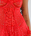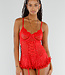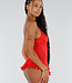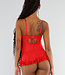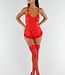 Dieses rote Dessous-Set besteht aus einem Oberteil im Korsettstil, einem Slip und passenden Netzstrümpfen. Das Oberteil ist aus transparentem Mesh-Stoff mit einem Muster aus aufgedruckten glänzenden Punkten, Spitzencups und einem Schnürverschluss auf der Vorderseite gefertigt. Die Cups sind mit Bügeln für zusätzlichen Halt versehen. Am unteren Rand des Oberteils befinden sich verstellbare Strumpfhalter und Rüschen entlang des Saums. Der passende Slip ist aus elastischer Spitze gefertigt. Das Set wird komplett mit roten Netzstrümpfen mit elastischen Spitzenbündchen geliefert.