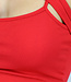 Dieses Oberteil ist aus einem gerippten Stoff gefertigt. Über der Brust befindet sich ein großer Ausschnitt, der den Anschein erweckt, dass ein zusätzliches Oberteil darüber getragen wird. Das Top ist sehr dehnbar und hat eingearbeitete Pads. Das macht das Tragen eines BHs überflüssig.