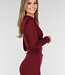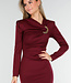 Rotes Midikleid mit figurbetonter Passform und glatter, einfarbiger Textur. Das Kleid hat lange Ärmel und einen einzigartigen drapierten Ausschnitt, der durch einen goldfarbenen Ring zusammengehalten wird. Die Schultern sind leicht strukturiert und mit Schulterpolstern versehen, die für eine elegante Form sorgen. Die Länge reicht bis zur Mitte der Wade und sorgt für einen stilvollen, raffinierten Look.