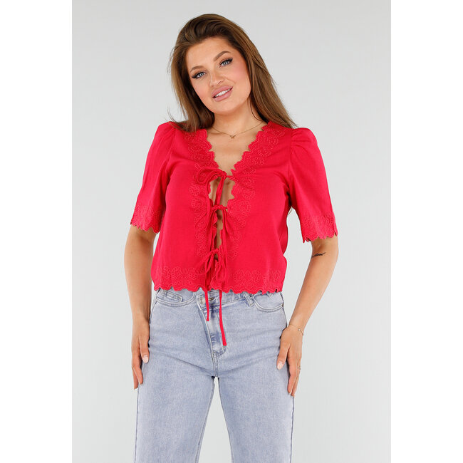 Dieses rote Oberteil aus Leinenstoff hat kurze Puffärmel mit gesticktem Besatz am Ärmelsaum und am Ausschnitt. Das Oberteil hat einen tiefen V-Ausschnitt mit dekorativer Stickerei und einen Verschluss, der aus drei Schleifen auf der Vorderseite besteht. Der untere Saum und der Halsausschnitt sind mit einer dezenten Wellenkante versehen. Der Stoff ist leicht und hat eine sichtbare Leinenstruktur. Die Passform ist gerade und endet knapp über der Hüfte.