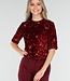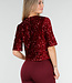 Dieses rote Oberteil ist vollständig mit Pailletten besetzt. Es hat kurze Ärmel, eine gerade Passform und einen Knopfverschluss am Rücken. Hergestellt aus leicht glänzendem Stoff mit gefütterter Innenseite für zusätzlichen Tragekomfort.
