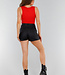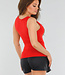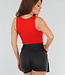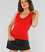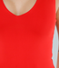 Dieses rote Oberteil ist ärmellos und hat einen tiefen, gefütterten V-Ausschnitt. Es hat eine schmale Passform, die einen guten Sitz am Körper garantiert. Der Stoff ist glatt, dehnbar und hat ein leicht glänzendes Finish. Der Saum ist gerade geschnitten und fällt bis zur Hüfte. Die Schulterträger sind breit und verlaufen gerade über die Schultern. Der Rücken ist einfarbig.