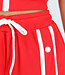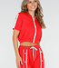 Dieses zweiteilige rote Set besteht aus einer verkürzten Strickjacke und einer passenden Hose mit weitem Bein. Die Strickjacke hat kurze Ärmel, einen Stehkragen und einen weißen Reißverschluss auf der Vorderseite. Die Hose hat einen elastischen Bund mit weißem Kordelzug und ist mit vertikalen Paspeln und Druckknopfdetails an den Seiten versehen. Die Druckknöpfe können teilweise geöffnet werden, wodurch ein zusätzlicher Schlitz an den Seiten der Hose entsteht. Beide Teile sind aus einem geschmeidigen Stretch-Stoff gefertigt.
