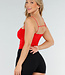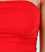 Dieses rote Oberteil hat dünne Spaghettiträger und einen geraden Ausschnitt. Auf der Vorderseite befinden sich Polster für zusätzlichen Halt. Der Stoff ist glatt, super dehnbar und liegt eng am Körper an. Der Rücken hat ein horizontales Band für zusätzliche Stabilität. Das Modell fällt am Oberkörper kurz aus.