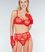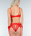 Dieses Dessous-Set besteht aus mehreren Teilen und ist aus rotem Netzstoff mit transparenter Struktur gefertigt. Der BH hat verstellbare Träger und Bügel-Cups mit Spitzenbesatz. Der passende Slip ist hoch geschnitten und aus dem gleichen Spitzenmaterial gefertigt. Ergänzt wird das Set durch einen Strumpfgürtel mit verstellbaren Bändern und Mesh-Handschuhen. Die dazugehörigen Strumpfhalter sind vollständig verstellbar, sodass die Passform genau angepasst werden kann.