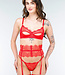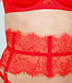 Dieses wunderschöne rote Dessous-Set besteht aus einem Bralette mit Bügeln, Ausschnitt und hochgeschnittenem Korsett, das die Taille betont und mit einem Strapsgürtel und passendem Ring versehen ist. Die zarte Spitze und die verstellbaren Träger sorgen für einen zusätzlichen Hauch von Sinnlichkeit.