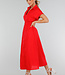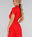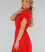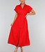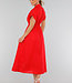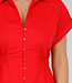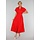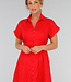 Dieses rote Hemdblusenkleid hat eine Midi-Länge und eine gerade Silhouette, die durch einen elastischen Einsatz an der hinteren Taille angepasst wird. Das Kleid hat einen klassischen Hemdkragen, kurze Ärmel mit festen Umschlägen und einen durchgehenden Knopfverschluss mit kleinen runden Knöpfen. Es fällt bis zur Mitte der Wade und hat einen leicht ausgestellten Rock. Der Stoff ist einfarbig und strukturiert, ohne Stickerei.