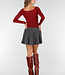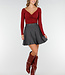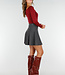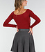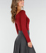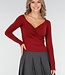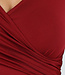 Dieses rote Oberteil ist aus einem glatten, einfarbigen Stretch-Stoff gefertigt. Das Oberteil hat eine taillierte Passform mit langen Ärmeln und einer leichten Falte auf der Vorderseite. Der Halsausschnitt verläuft diagonal in einer Überlappung. An der Seite sind feine Raffungen eingearbeitet, die den Stoff leicht nach oben ziehen. Das Material ist geschmeidig und dehnt sich gut.